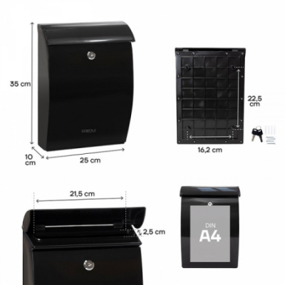 · Es un buzón de correos de líneas modernas, con una tapa superior que oculta la boca del buzón y la protege del agua de lluvia.