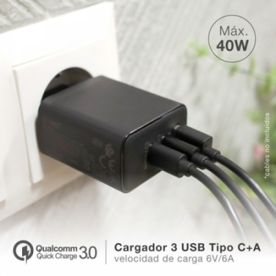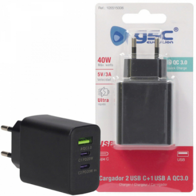 CARGADOR RAPIDO 5v/3A 40w 3 USB: 1xQC3.0 + 2xTipo C QUALCOMM 105515006 GSC