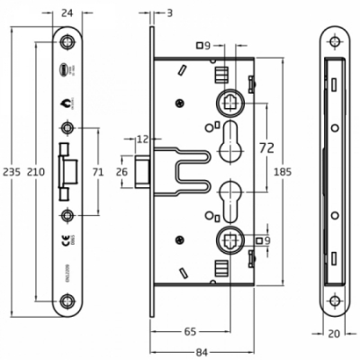 · Cerradura para puertas cortafuego sin función antipánico con doble nueca y doble alojamiento de cilindro.