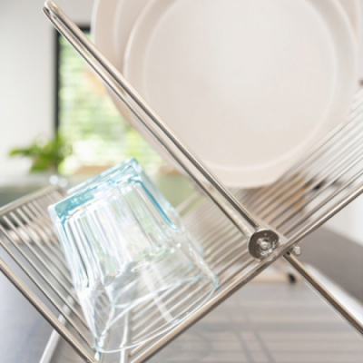 · Escurreplatos con capacidad para 16 platos y con un sistema de pliegue fácil en forma de X, con bandeja en plástico.