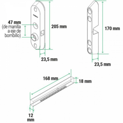 - Manilla interior fabricada en zamak de alta resistencia. Con pomo de plástico ABS y manilla de nylon con interior de aluminio. Cerrojo (pestillo) integrado de acero. Mide 168 x 18 x 12 mm y se abre y se cierra con el giro de la llave.