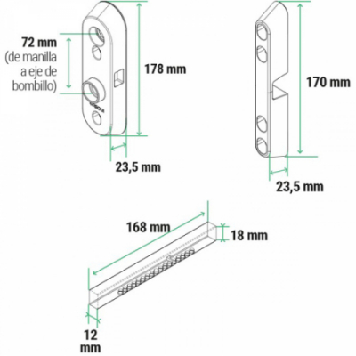 - Manilla interior fabricada en zamak de alta resistencia. Con pomo de plástico ABS y manilla de nylon con interior de aluminio. Cerrojo (pestillo) integrado de acero. Mide 168 x 18 x 12 mm y se abre y se cierra con el giro de la llave.