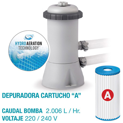 - CAPACIDAD: 5.621LtsPiscina Esy Set redonda INTEX medidas Ø305x76 cm y capacidad de 5.621 litros, con conexiones de Ø 32 mm para depuradoras con tubos del mismo diámetroDiseño: fabricada en color azul, con tejido resistente, tres capas laminadas de PVC-Poliéster que aportan mayor firmeza y resistenciaDepuradora: incorpora depuradora de 1.250 l/h con filtro tipo H, conexiones de Ø 32 mm y con sistema Hydro Aeration Technology que mejora la filtración y aumenta la pureza del aguaMontaje: tiempo de montaje 10 min, instalar sobre una superficie lisa, nivelada y estableAccesorios: incluye tapón de vaciado, depuradora y manual de instrucciones